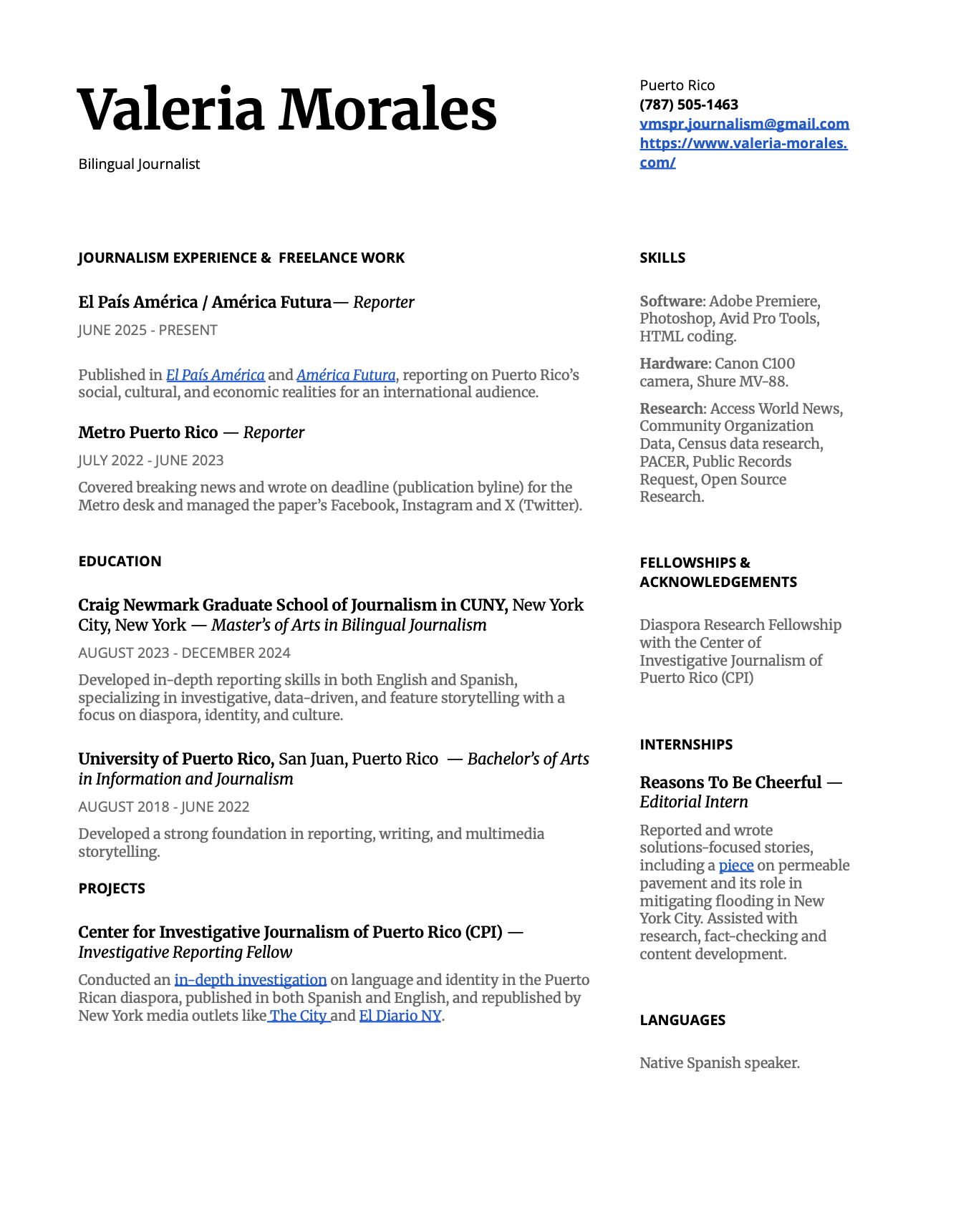After earning my Master’s in Bilingual Journalism from the Craig Newmark Graduate School of Journalism at CUNY in December 2024, I returned to Puerto Rico and began reporting on stories at the intersection of culture, identity, and social issues.
